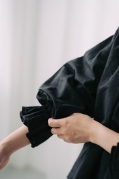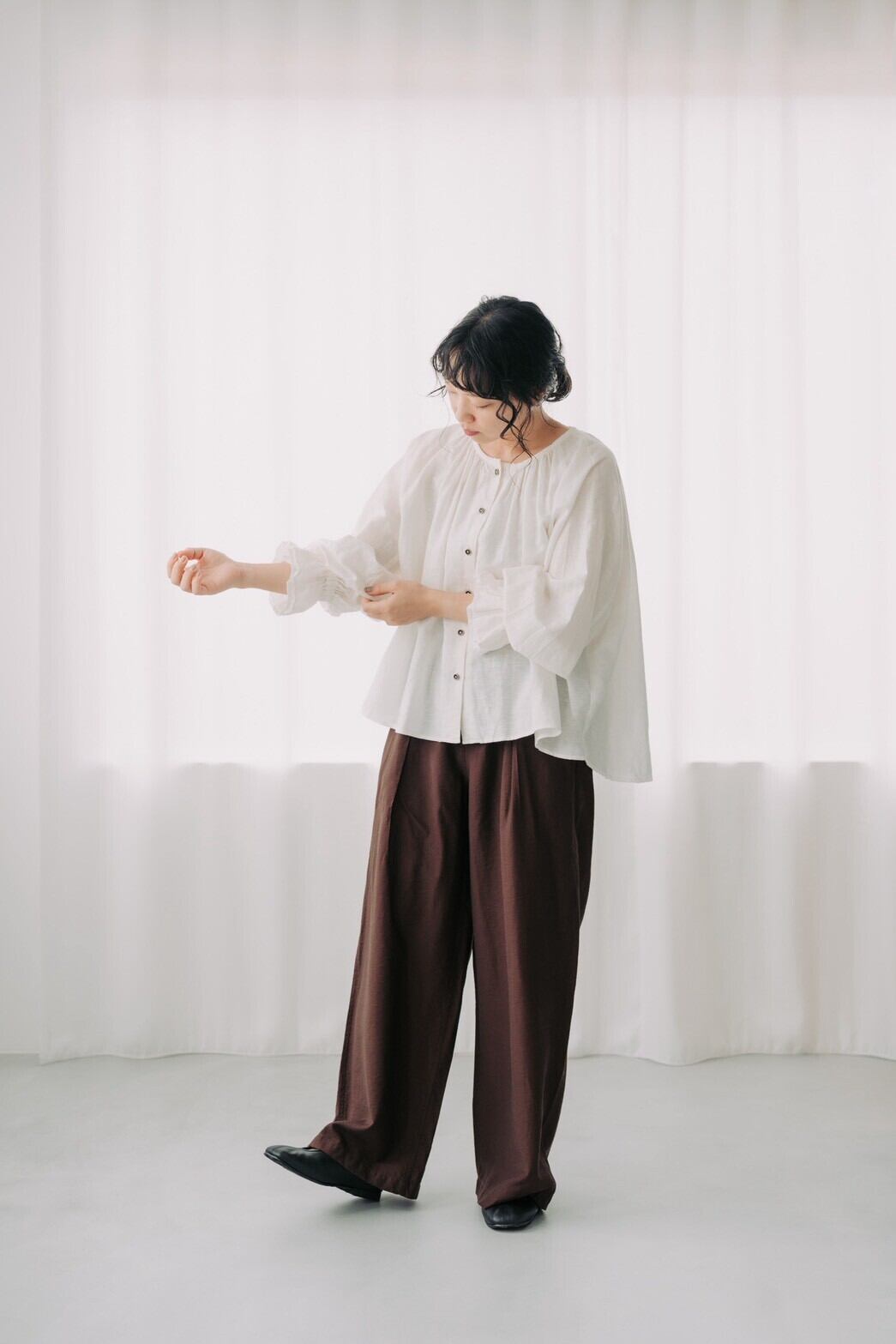 首周りはシンプルなクルーネックのため、1枚ではもちろん、ケープやストール、ボリュームのある耳飾りといった、顔周りをいろどる服飾雑貨との相性もよいデザインです。