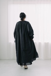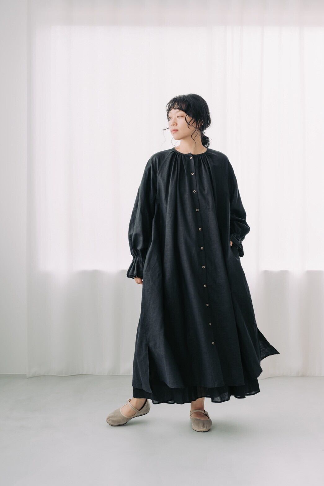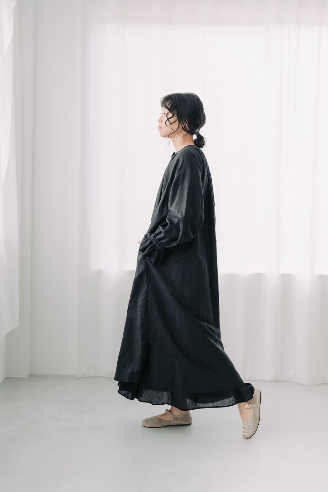 通年使えるリネンコットン素材の、ボリュームのあるパフスリーブが印象的なワンピース。