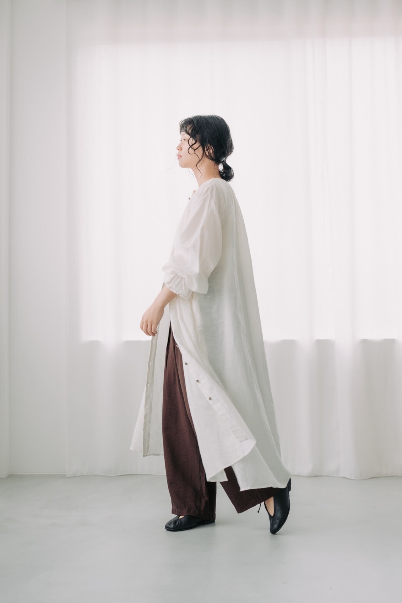 素材は着るほどにその人に馴染む、リネンコットンの平織り生地。薄すぎず、厚すぎず、肌触り滑らかな通年素材を使用しています。
