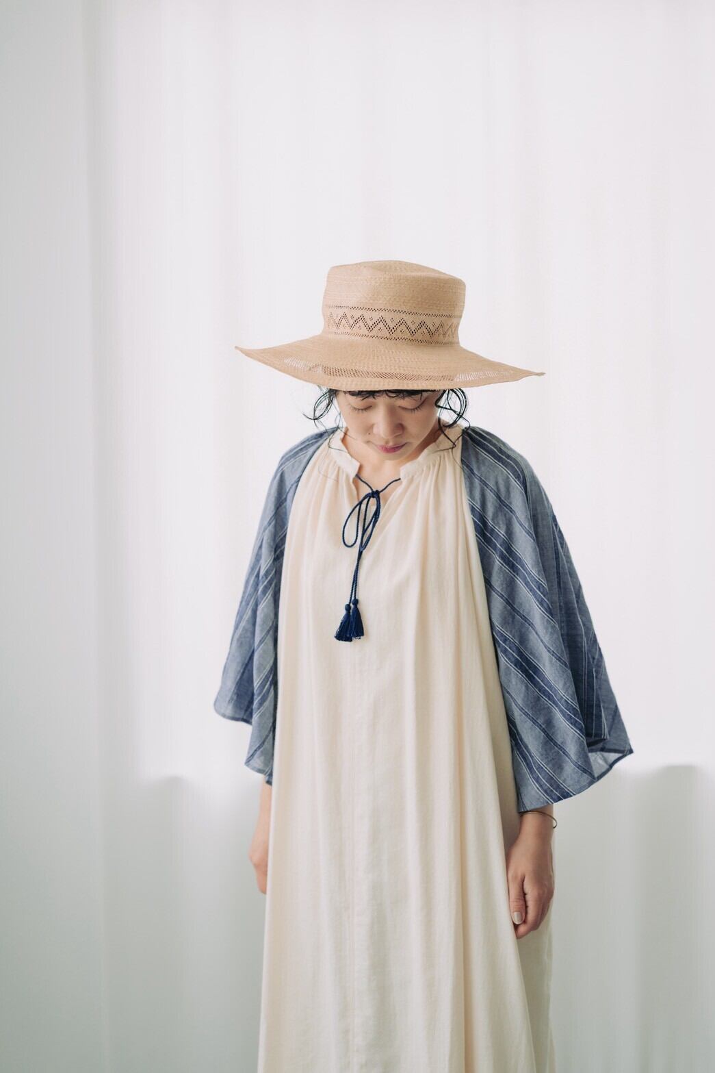 首元のタッセルコードは結んでも、垂らしてラフに楽しんでも。